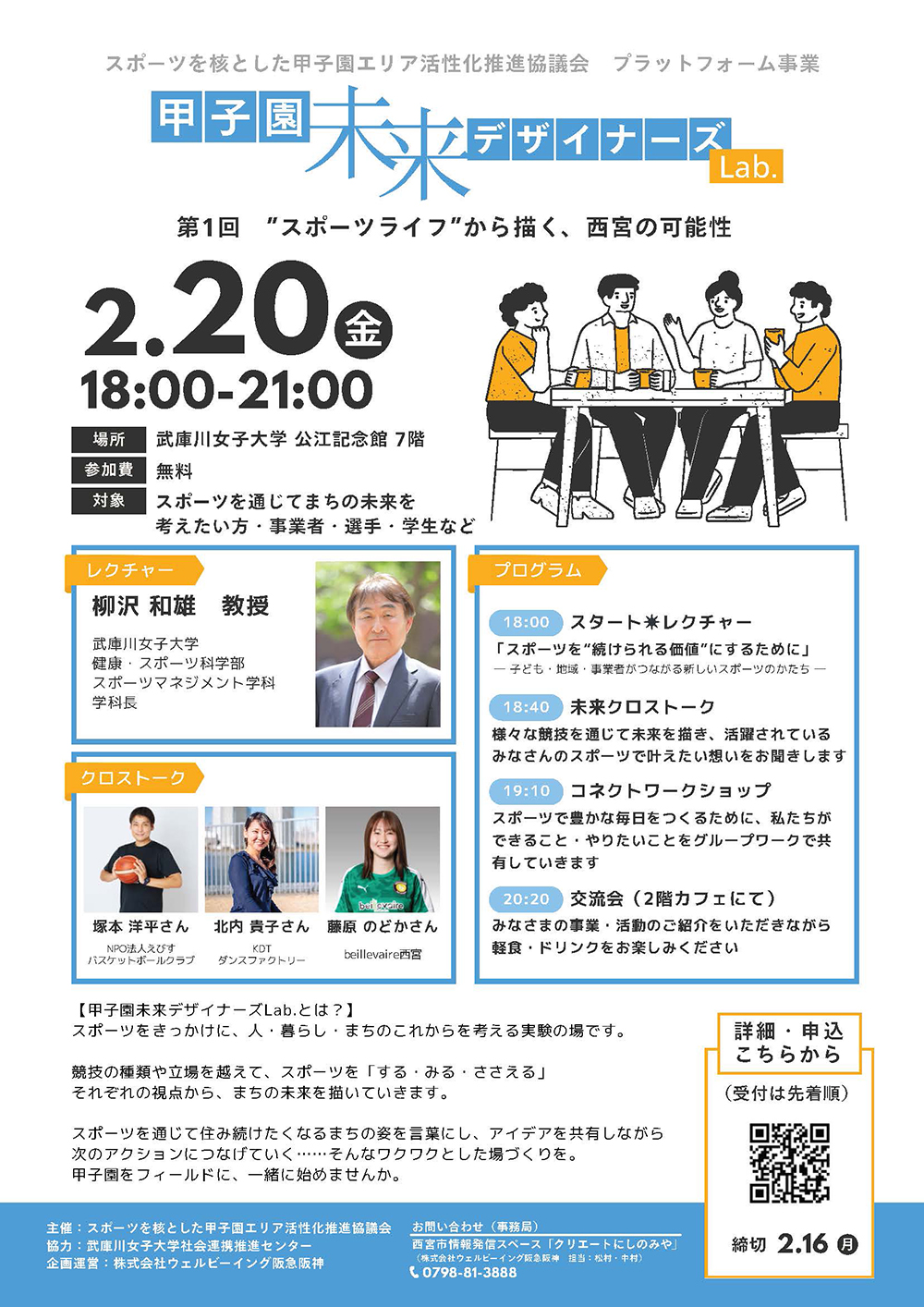 武庫川女子大学 健康・スポーツ科学部 スポーツマネジメント学科 学科長 柳沢和雄 教授によるレクチャーを起点に、西宮で新しいスポーツの価値を築いている事業者・選手3名を迎えたクロストーク、さらに参加者同士で今後の西宮におけるスポーツ事業について語り合うワークショップを行います。