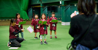甲子園歴史館のお仕事体験コンテンツです。専任のツアーガイドから阪神甲子園球場のスタジアムツアーの仕事内容を学び、保護者の皆さまを実際にご案内します。お仕事体験を通して、球場内の設備や歴史についても知ることができます。「甲子園歴史館入館」と「『BE-STADIUM KOSHIEN』トスバッティング又はピッチングのうち1種目体験」の特典付きです。